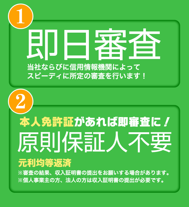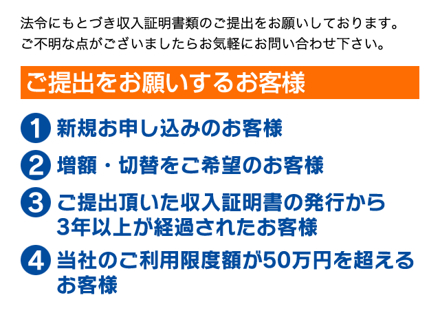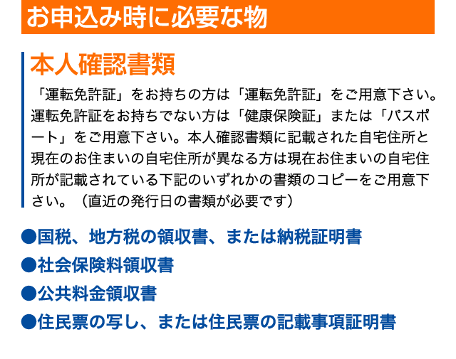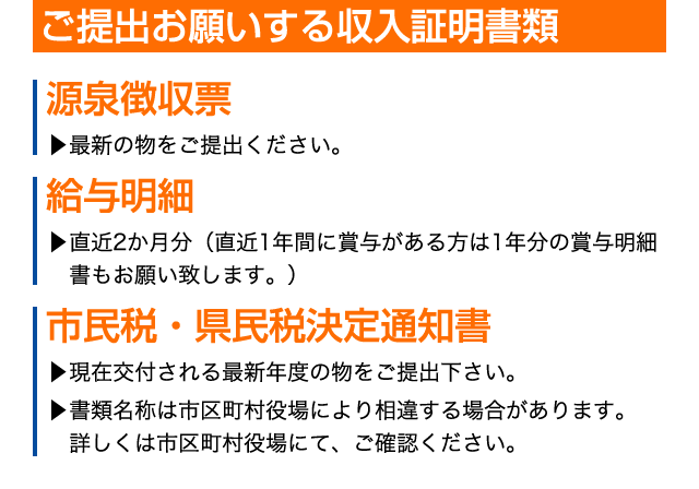 本人確認書類・収入証明書類が必要となります。お申込みの際には、ご用意下さい。