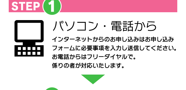 お申込フォームから必要項目をご入力いただくか、フリーダイアル(0120-800-485)までお気軽にお問い合わせください。